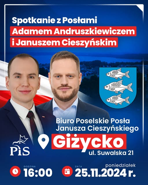Serdecznie zapraszamy na spotkanie wszystkich mieszkańców Giżycka, które odbędzie się 25.11.2024 r. o godzinie 16:00 w moim biurze poselskim. Do zobaczenia!