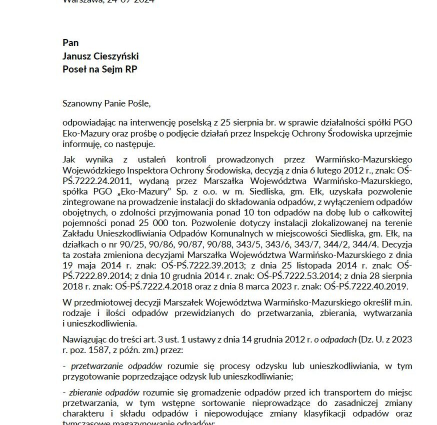 Problem uciążliwego smrodu z wysypiska w Ełku nadal budzi emocje i frustrację mieszkańców. Moja interwencja w tej sprawie dotarła do Ministerstwa Klimatu i Środowiska, gdzie złożyłem prośbę o ocenę zgodności działań firmy Eko-Mazury z obowiązującymi przepisami i pozwoleniami. Niestety, odpowiedź wiceminister Anity Sowińskiej wskazuje, że…. na papierze wszystko jest zgodne z prawem.